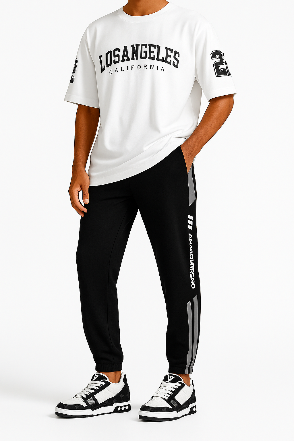 Step up your streetwear game with these sleek black joggers, featuring bold contrasting stripes and modern graphic details. Designed for both comfort and style, the joggers boast a drawstring waist for a customizable fit, while the printed "FASHIONTREND" logo adds a trendy touch. Perfectly paired with stylish sneakers, these joggers are ideal for casual outings or gym sessions. The clean black color with minimalistic gray accents ensures you look effortlessly cool wherever you go.